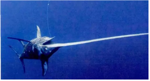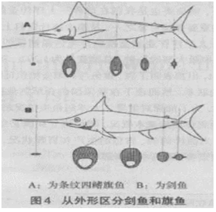身躯上:剑鱼身躯肥状略呈延伸的圆柱状,而旗鱼的身躯稍瘦呈纺锤形。 ![]()