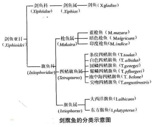 分类上:剑鱼隶属鲈形目剑鱼亚目剑鱼科,科中只有一个剑鱼属,属中只有剑鱼1种鱼种。旗鱼隶属鲈形目剑鱼亚目旗鱼科的鱼类,科中有枪鱼属、四鳍旗鱼属、旗鱼属三个属,在旗鱼属中有大西洋旗鱼、东方旗鱼2个鱼种。 ![]()