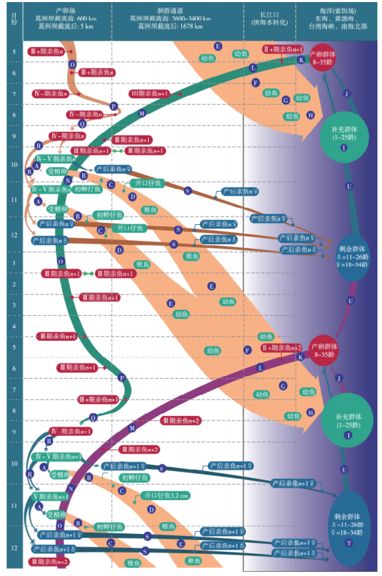 中华鲟是典型的洄游性鱼类,它们在海洋中成长,然后洄游到长江等淡水河流中繁殖。这种洄游习性使得中华鲟成为了连接海洋和淡水生态系统的重要桥梁。在洄游过程中,中华鲟会穿越多个生态系统,包括海洋、河口、河流和湖泊,这不仅体现了中华鲟的生态适应性,也反映了它们在生态系统中的重要角色。 食性 中华鲟的食性主要以底栖无脊椎动物和小型鱼类为主,成年个体在海洋中觅食,而在淡水河流中则主要以底栖生物为食。中华鲟的繁殖周期较长,长江中华鲟种群生活史全过程见图4,我们将中华鲟生活史分成从自然繁殖过程( 过程 A) 开始,经历孵化( 过程 B) 、藏匿( 过程 C) 、边滩浅水区索饵( 过程 D、E) 、到次年抵达长江口淡海水的转化过程,再逐渐入海,在海洋中索饵生长直至性成熟( 海洋索饵生长发育( 过程 I) ,此间经历漫长时间,平均为 14.3 年) ; 即将性成熟的中华鲟( 可能靠地球磁力线导航) 找到长江口( 过程 K) ,每年夏季开始溯江而上( 过程 L、M,可能靠嗅觉导航,很少迷途入支流) ,秋季最早到达的个体可到达产卵场江段( 过程 N) ,11 月至次年部分晚到的个体继续上溯到达产卵场江段或其下游深潭中越冬( 过程 O) ,春季及夏季在产卵场下游江段和产卵场之间依水情变化来回迁移,秋季再进入产卵场,进行自然繁殖,其经历 A ~ R18 个过程,完成了中华鲟第 1 次生殖的 1 个生命周期。 ![]() 图2