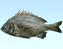 黑鲷简介黑鲷,别名乌颊鱼、黑立、黑鲷、海鲋、黑加吉。硬骨鱼纲,鲈形目,鲷科。长约15~30 cm。为暖温性底层鱼类。喜栖息于沙泥底质或多岩礁的浅海。摄食小鱼、小虾、贝类等。一般不作长距离洄游。生殖期为2~4月。幼鱼有雌雄同体现象。分布于朝鲜半岛、日本;中国沿海均产。为海洋经济鱼类,海水养殖的对象之一。用底拖网、手钓或延绳钓捕捞。 形态特征 体呈 长椭圆形,侧扁而高。体背面极狭窄,形成 棱状线。头中大,背缘浅弧形倾斜隆起至背 鳍起点,前部圆锥形,吻端钝尖。口中大,前 下位,稍斜裂。两颌等长。上下颌前端各有 犬齿6枚,上下颌两侧各有3行臼齿。眼中 大,侧上位; 眼间隔宽而隆起,宽为眼径的 2倍多。前鳃盖骨边缘平滑,鳃盖骨后缘有1 扁平钝棘。鳃孔中大。尾柄较粗,长为高的 1.4—1.7倍。背鳍1个,始于胸鳍起点背上, 基底长,由11根强鳍棘和11—12根鳍条组 成,棘可收于背沟中,第4棘最长。胸鳍尖 长,侧下位,第6鳍条最长,向下渐短,最 长鳍条可伸达肛门后至臀鳍起点。腹鳍较 小,始于胸鳍末基下方,有1棘。臀鳍基底 短,与背鳍鳍条部近相对,前缘有3棘,第 2棘粗壮而长。尾鳍叉形。体被较大弱栉鳞。 有侧线。体青灰色间有黄色,有若干条褐色 横纹,腹部色较淡。侧线起处有1黑斑。背 鳍基底黄色,边缘暗灰色。胸鳍黄色。腹鳍、 臀鳍暗黑色。尾鳍黄色,边缘黑色。幼体呈 浅灰色,体侧有6—8条深色横条纹,背鳍 暗灰色,尾鳍浅黄色,后缘黑色,其余各鳍 均灰白色,臀鳍间有黑色。体长一般为12— 30厘米。体长为体高2.4-2.6倍,为头长3.0-3.3倍。头长为吻尖2.5-3.2倍,为眼径3.8-5.1倍。体椭圆形,侧扁。头中大,左右额骨分离。上下颌前端各具6犬齿,两侧为臼齿。犁骨、腭骨、舌上无齿。鳃盖骨后端有一扁平棘。体被栉鳞,侧线完全,浅弧形。背鳍鳍棘部与鳍条部相连,中间无缺刻。腹鳍胸位,尾鳍分叉。体灰褐色,具银色光泽。侧线起点处有一黑斑,体侧有褐色纵条纹,各鳍边缘黑色。 生物学特征 黑鲷属沿岸内湾性鱼类,不游向外海,一般在5~50米水深的沿岸带移动,于5月初前后进入近岸内湾浅水区产卵,7~8月成鱼和幼鱼均就近索饵,9~10月逐渐移向较深且有岩礁的水域栖息。对环境的适应能力较强,能耐受盐度的大幅度变化,生存温度的极限为3.4~35.5℃,9℃以下停止摄食。在静水中的耐低温能力较真鲷稍强,可在7℃以上水温中越冬。对水中溶氧量要求较高,常温下3.2毫克/升为窒息点。 ![]()